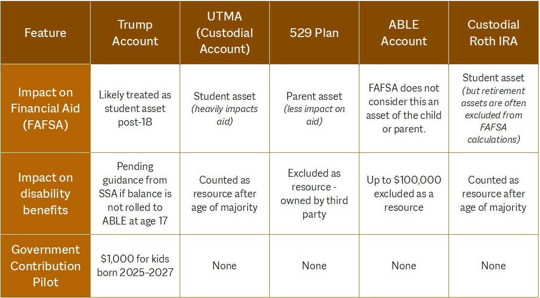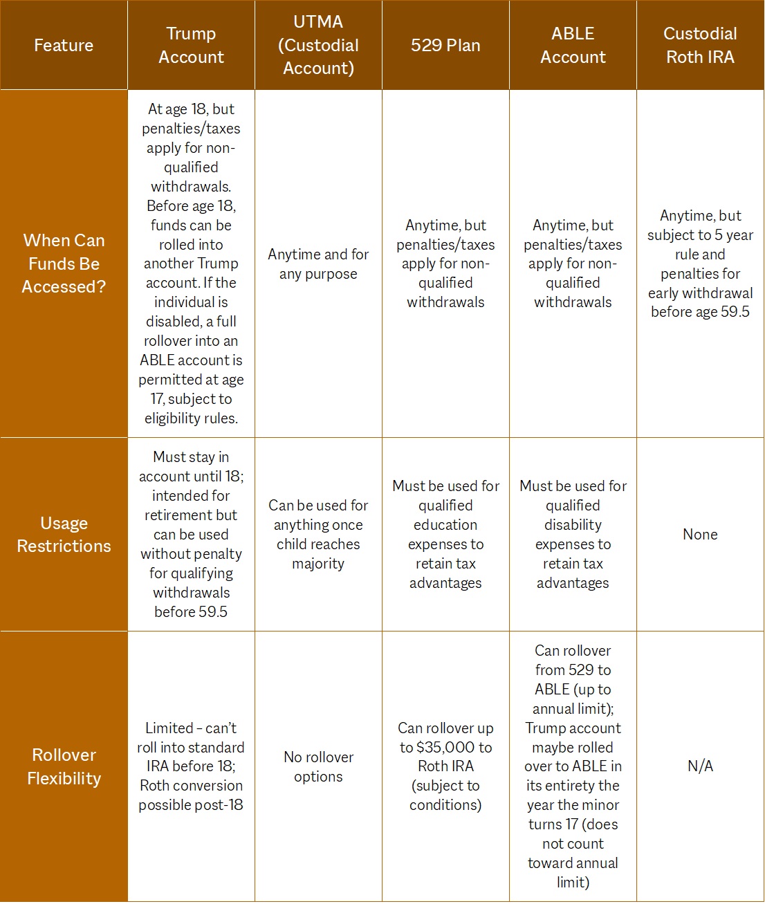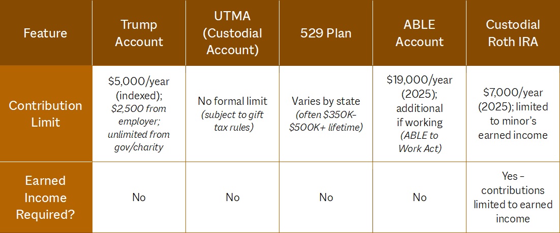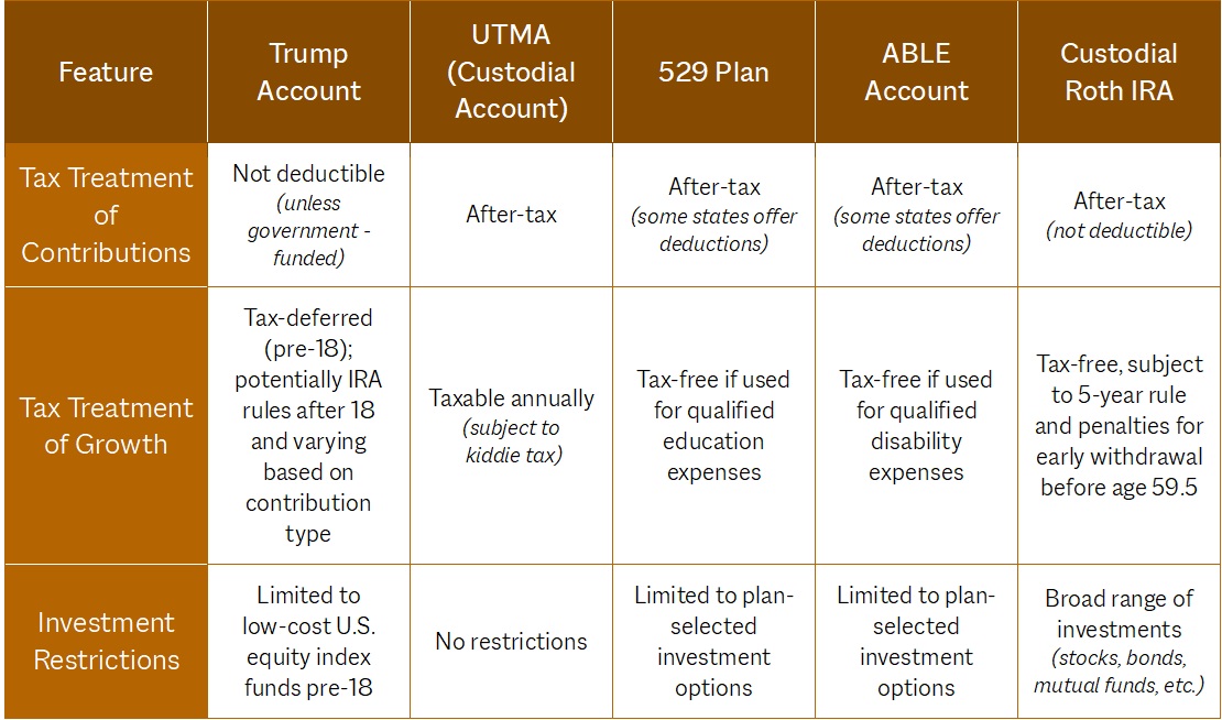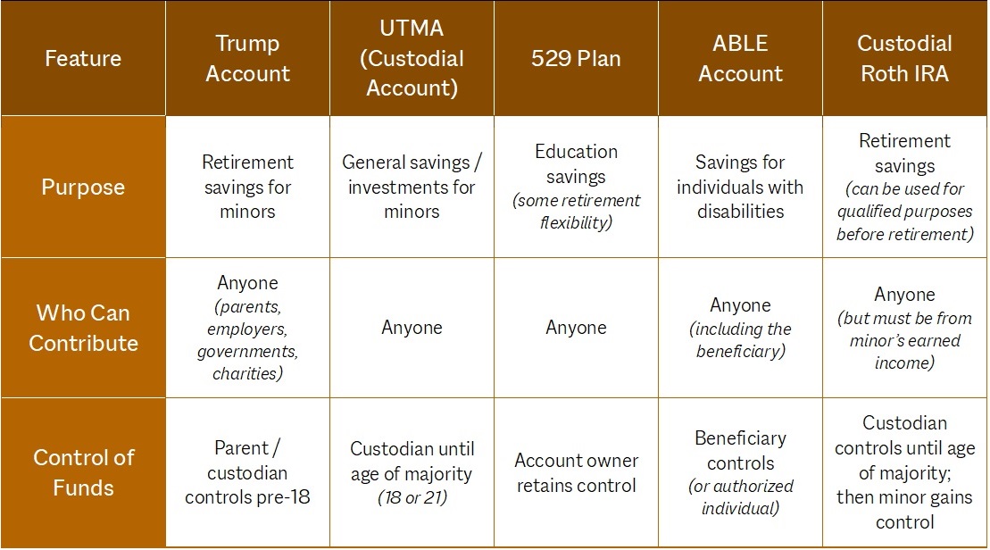 Below, we’ll unpack the mechanics of this account, highlight its unique features, and compare it to existing child-focused savings tools like 529 plans, and Uniform Transfers to Minors Act (UTMA) accounts, ABLE accounts, and Custodial Roth IRAs—so you can better understand its place in the evolving landscape of financial planning.