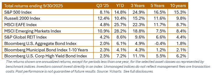 As we wrap up this quarter’s commentary, we’re reminded that just as summer gives way to autumn, markets too move through cycles—shaped by innovation, policy, and investor sentiment. While we continually update, adapt, and refine our strategies, the core principles of investing remain steady. Diversification, discipline, and a long-term perspective are not just ideas—they’re proven strategies that help investors stay grounded amid change. This year, international equities are leading U.S. equities, corporate bonds are ahead of Treasurys, and real estate and small caps both have strong, postive returns, reinforcing that principle.