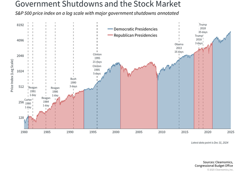 Shutdowns have occurred under presidents from both parties, and while the real impact on government workers is significant, markets have generally looked beyond the political gridlock. The accompanying chart shows that even during the most contentious shutdowns—including those in Reagan, Clinton, Obama and Trump administrations—markets remained resilient. Historically, shutdowns have acted as temporary disruptions, not lasting threats to economic growth or long-term investment performance.