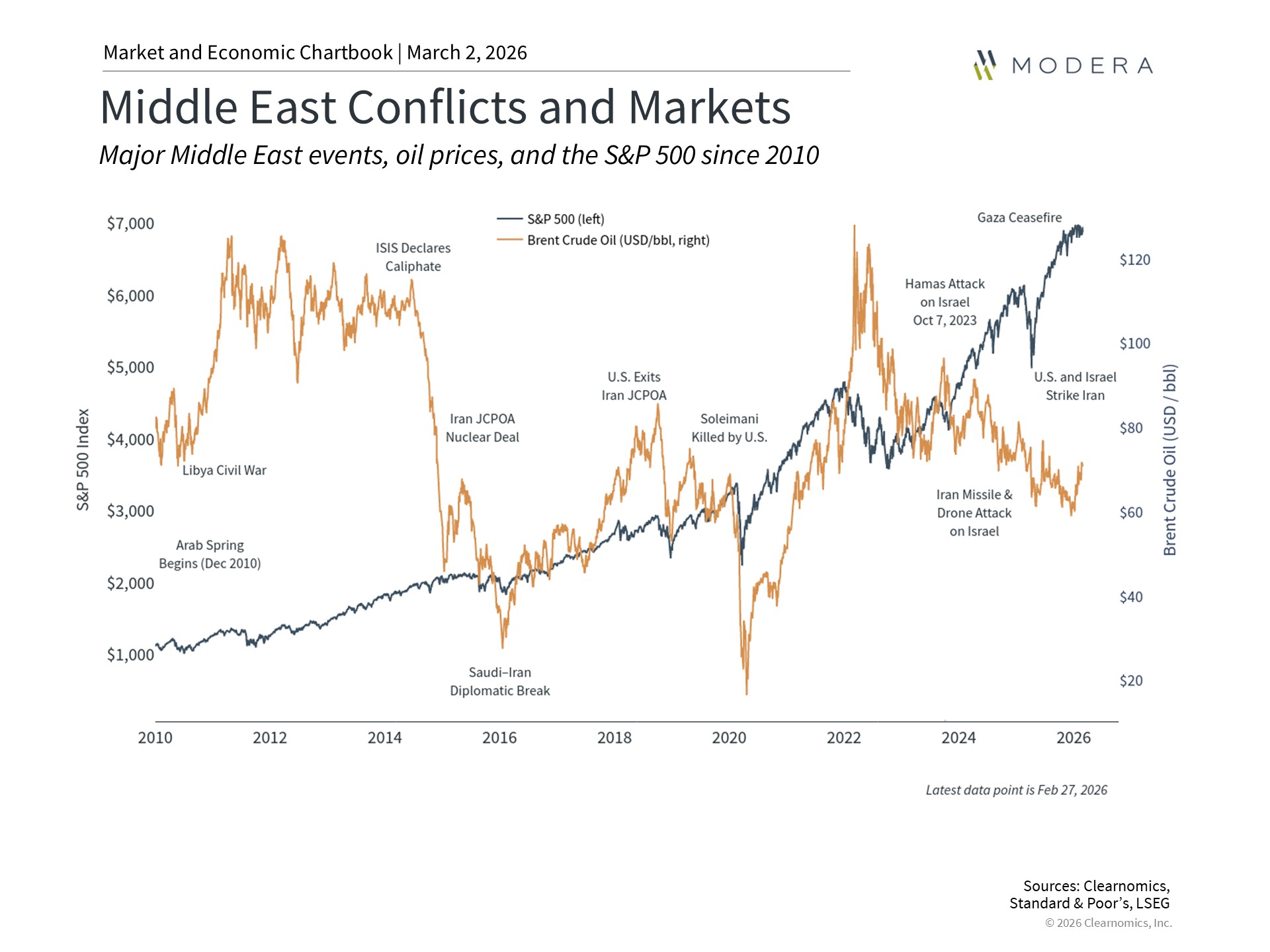 The graph below charts the relationship of oil prices to the S&P 500 throughout previous conflicts. While the scale of the current strikes is significant, tensions between the U.S., Israel, and Iran have been escalating for some time. The scope of the latest strikes, including the targeting of Iran’s senior leadership, is broader than previous engagements. However, history also makes it clear that these conflicts themselves are not always a catalyst for market movements.